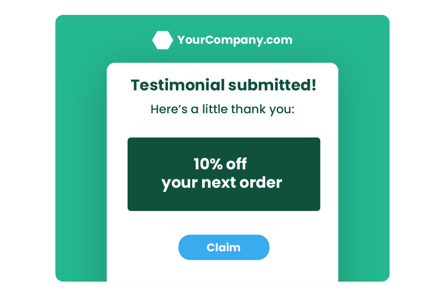 Reward loyal customers with an incentive to complete their testimonials. Set up within the form builder in minutes.
